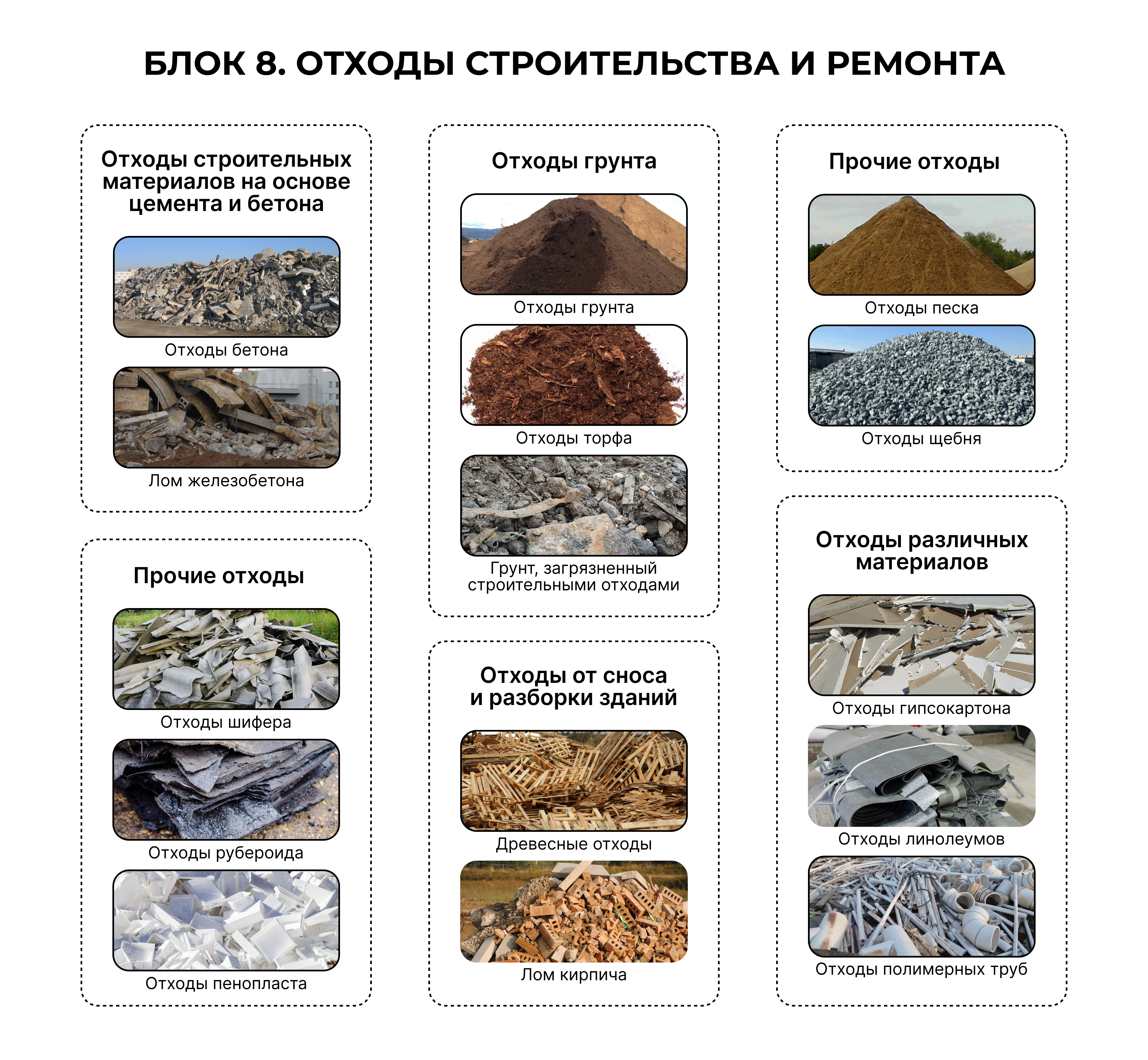 Строительный мусор может содержать различные материалы, каждые из которых требуют особого подхода при сборе и вывозе. Наиболее распространенные виды: